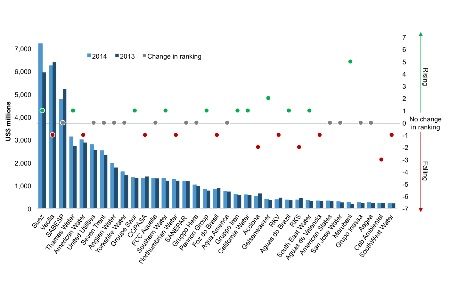 Between 2013 and 2014, eleven companies moved up in the global top 35 consolidated rankings by revenues, reflecting changes in company strategies, M&A activity, and macroeconomic conditions. Key ranking moves among the top five largest groups globally, on a revenue basis, were Suez surpassing Veolia for the top ranking and Thames Water overtaking American Water in the 4th position. Brazil’s SABESP retained its 3rd place ranking and remains the top ranked private national water utility based on population served and volume of water produced annually. Drivers for growth include a combination of M&A, rate increases, and concession awards that reflect a unique time in which players seek incremental growth abroad while defending their positions in more mature home markets.