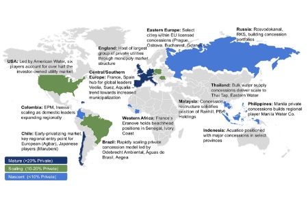 The private sector’s role in water utilities continues to be debated– in developing countries the promise of closing water infrastructure gaps, while in some mature markets, governments are buying-back water systems. At the same time, access to water supplies is increasingly threatened by climate change and inadequate public investment in infrastructure. These factors contribute to a challenging competitive environment, with the result being a significant shake-up in global private water utility rankings according to a new study from Boston-based Bluefield Research.